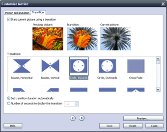 Microsoft Photo Story vous donne la main sur de nombreuses autres options. L'ordre des photos, la suppression des bords noirs, l'ajout de texte, les transitions entre chaque photos (48 modèles), l'ajout d'un commentaires audio ou de musique... Vous décidez de quasiment tout.